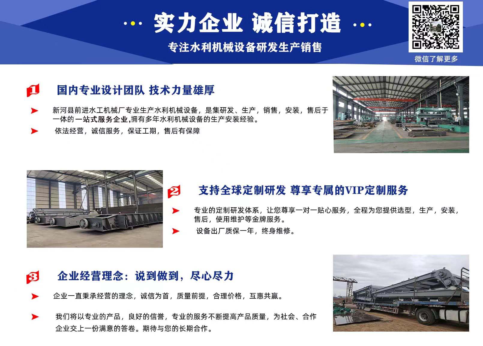新河縣前進(jìn)水工機械廠是一家專門從事水利工程設(shè)備研發(fā)生產(chǎn)的廠家,現(xiàn)有員工228人,各類高、中級專業(yè)工程技術(shù)人員近30人,技術(shù)生產(chǎn)工人180多人。公司占地面積14674平方米。公司擁有車、鉗、刨、銑、冷作、鈑金、鑄造等,工種齊全,加工能力和技術(shù)力量雄厚,并具備理化測試手段與儀器設(shè)備。前進(jìn)水工專注景觀閘門,鋼壩,合頁壩,液壓升降壩,液壓閘門,臥倒門,一字門,人字門,液壓啟閉機,卷揚啟閉機,螺桿啟閉機,清污機,除污機,閘門,拍門等設(shè)備的研發(fā)與生產(chǎn),是新河水利工程產(chǎn)品行業(yè)的領(lǐng)跑者,不僅在同行業(yè)群中揭起了一次又一次的技術(shù)革新,更為水利工程企業(yè)提供了更高更大的選擇平臺。
